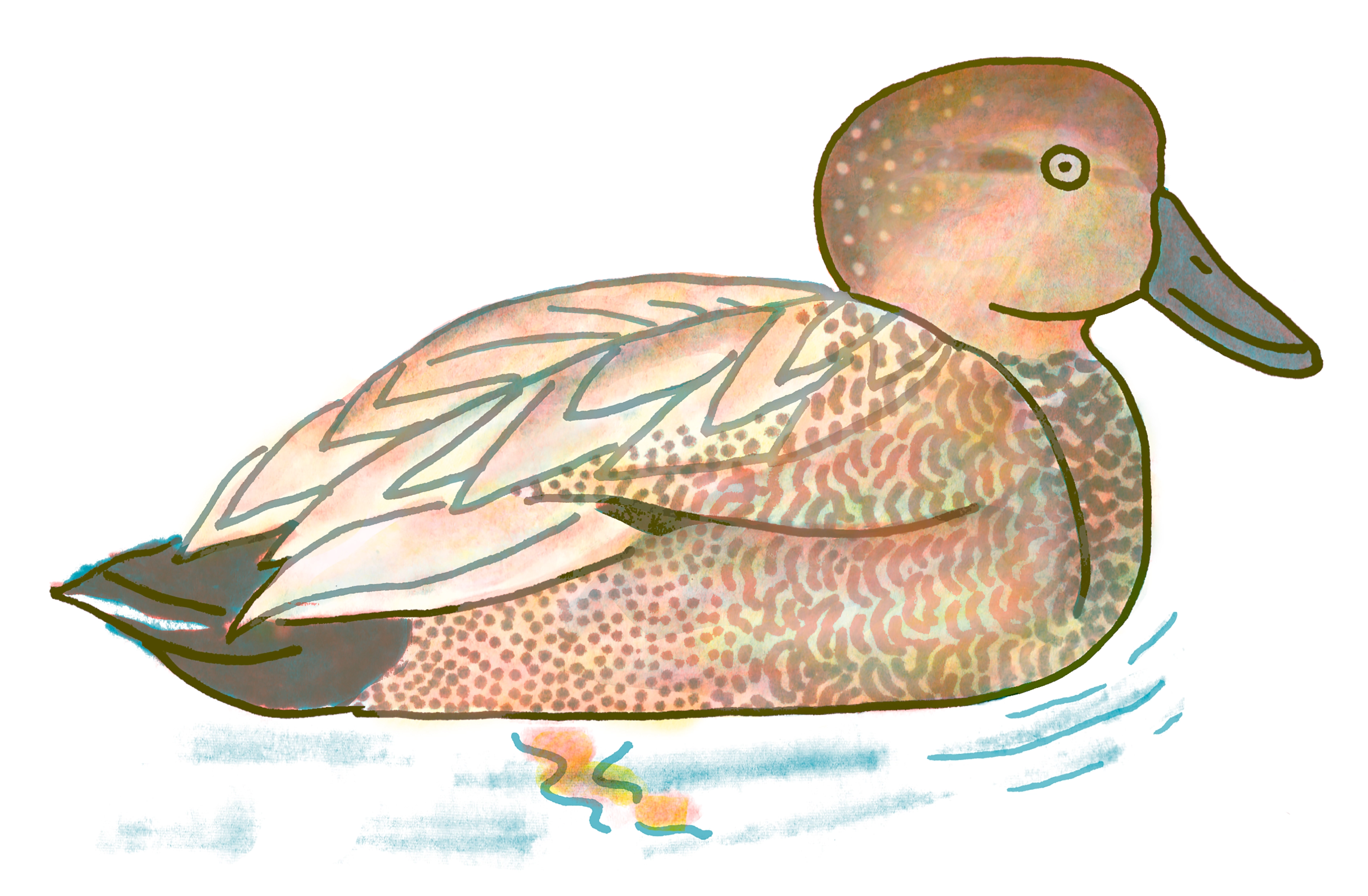 The brownish gray overall coloring of this duck may not be exciting, but there is an understated elegance to the Gadwall. On closer inspection, its feathers are a great example of vermiculation, or the dizzying fine-line patterning of the plumage found in many waterfowl, which is present on the breast and lower sides. The female is similar in appearance to the female mallard, but with a darker slimmer bill. Both have a white speculum, or wing patch, which is more visible when in flight.