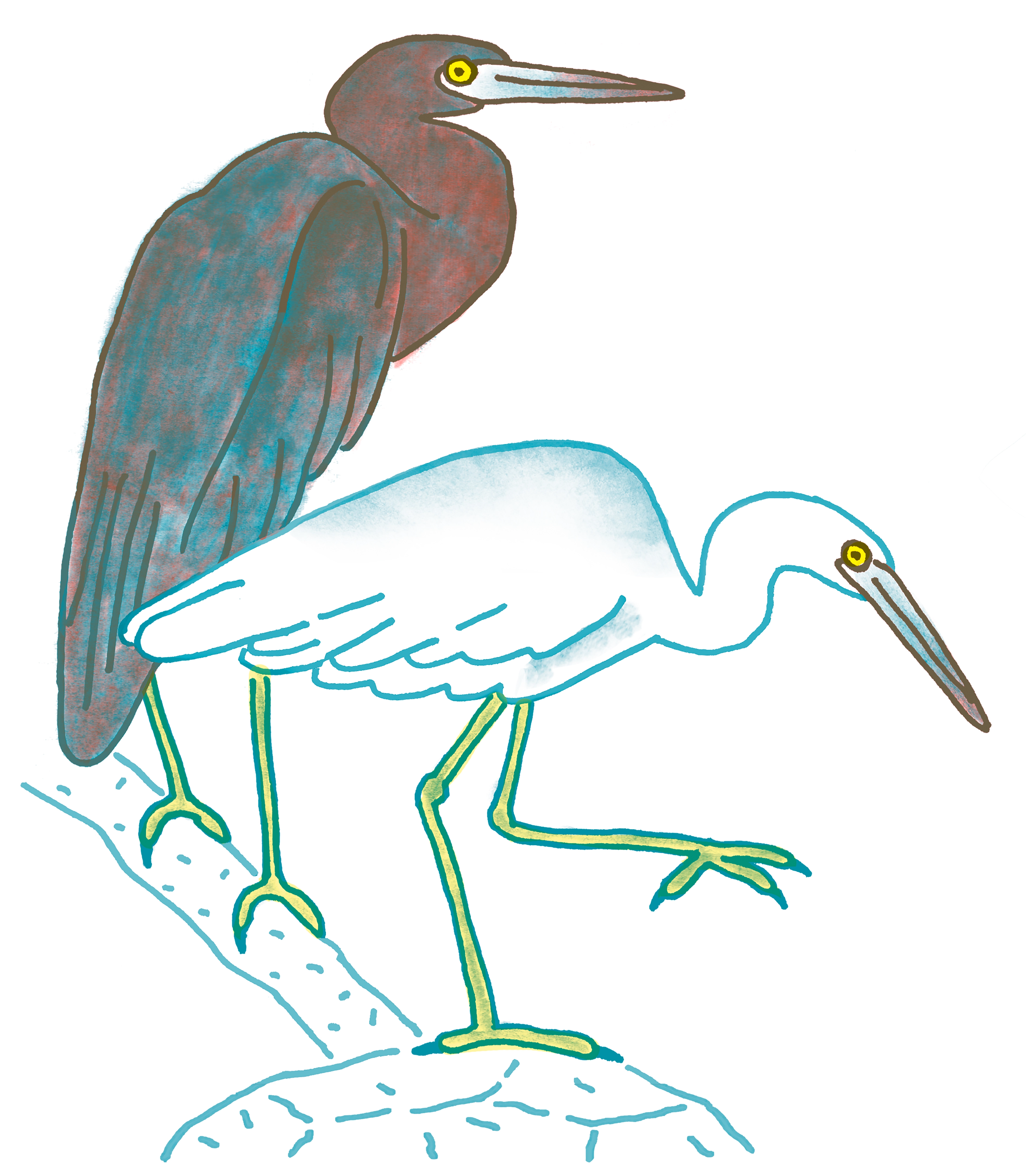 A tiny heron with very different coloration depending on its age. Juveniles are white with gray-green legs and skin patch near the eyes, while the adults have a maroon head and neck with a dark gray body. Both have a bicolor bill, which is dark at the tip and lighter closer to the head. The juveniles can often be found mixed in with egrets, since foraging with other birds makes it easier to find food and gives them protection from predators. It is believed the other species are more tolerant of this heron at this stage in its development due to its similar coloration.