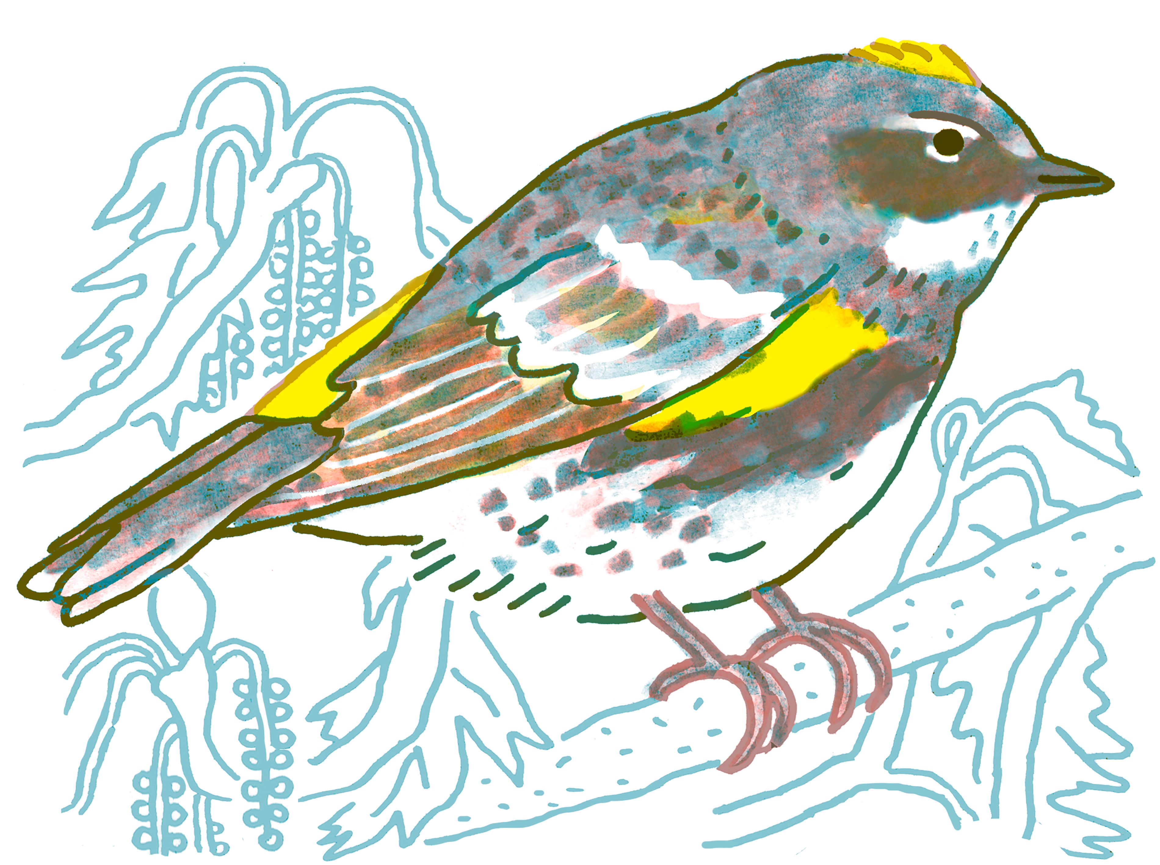 This bird not only has a yellow rump, but yellow on the top of its head and on the sides. Males are generally gray with a black mask and chest, while the females are lighter in color and a brownish gray. They have a wide diet that includes insects and berries, which gives them more leeway to winter further north compared to other warblers.